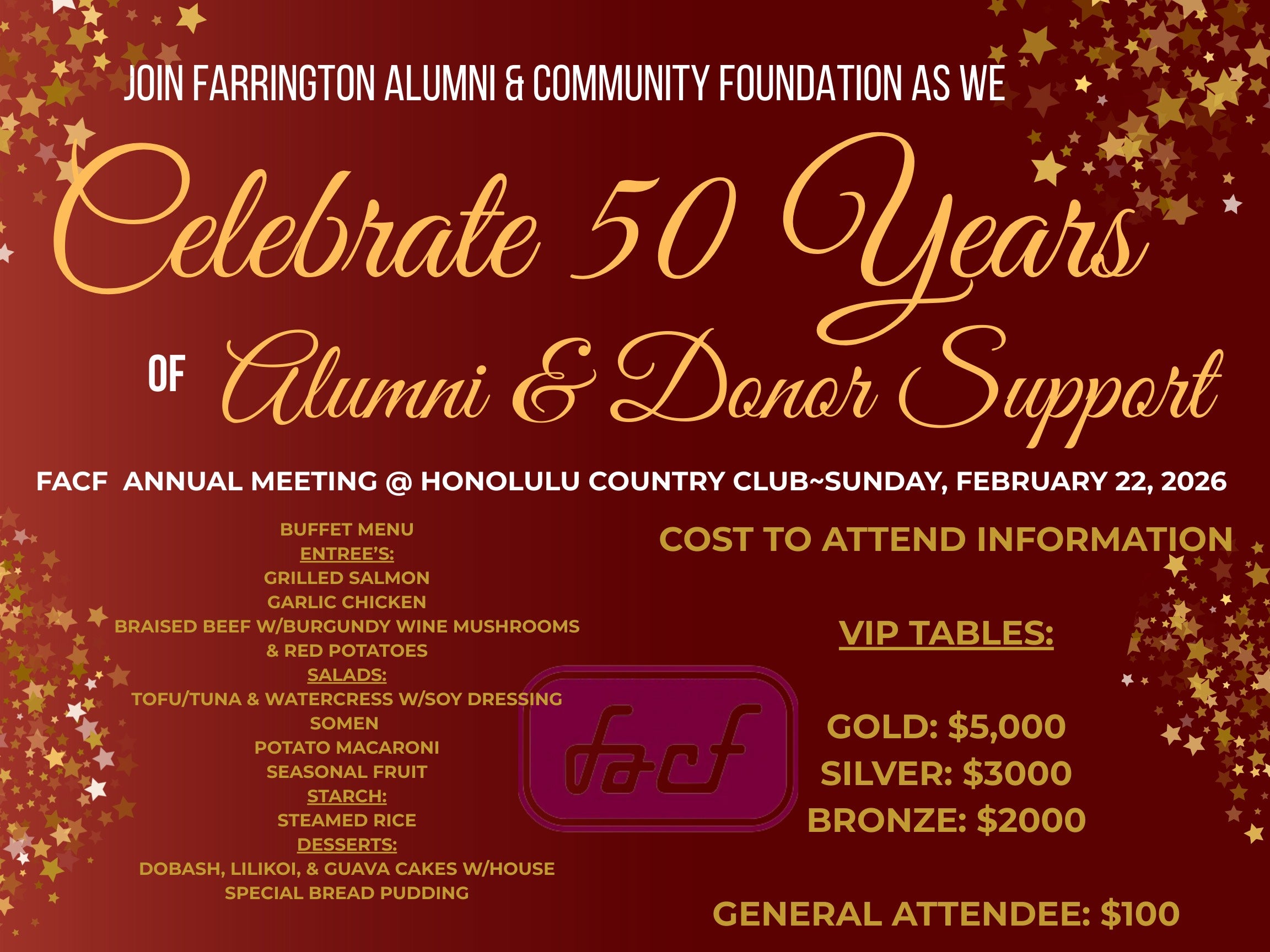 The Alumni of the Year shall be someone who has worked for the benefit of Farrington High School or has brought positive recognition as a Graduate FHS.